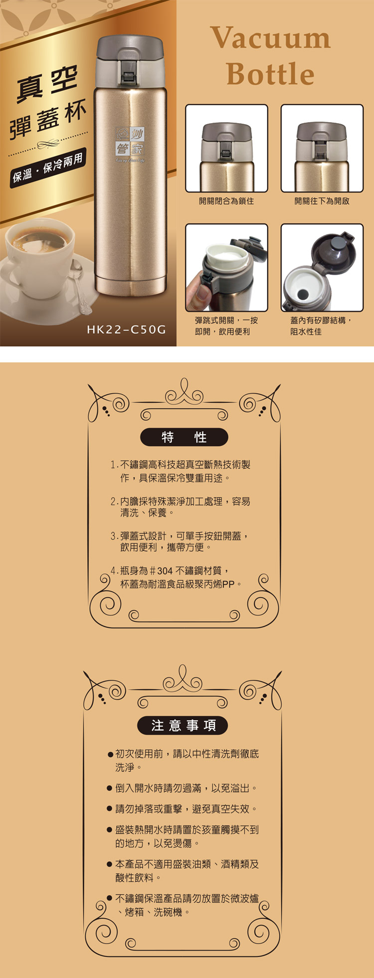 | 購買 內外採用優質#304不鏽鋼 妙管家 真空彈蓋杯/保溫杯(金色)500ml HK22-C50G:27601,店家為 達益購 | 樂天市場購物網 - 台灣 售價:699 我要購買 |